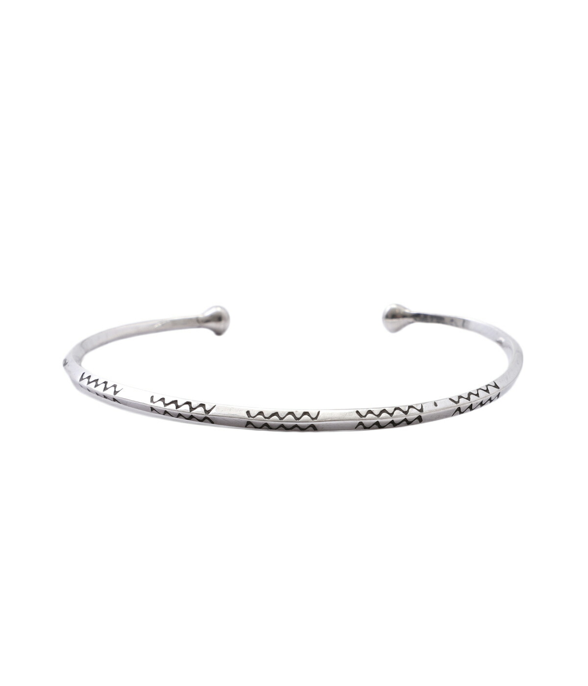 北アフリカ先住民族トゥアレグ族が手掛けるシルバー925製ブレスレット。中央の象徴的な文様と周囲に施された鱗のような細密な手彫りが特徴で、1刀1刀の彫刻には事物や物語、寓意の意味が込められています。細身で他のブレスレットとも重ね付けしやすく、シンプルながら確かな存在感でコーデのアクセントに最適。ハンドメイドのため個体差があり、付属袋のデザインも一点一点異なる仕様。サイズはFREE(ONE)(幅0.4cm、内周17.5cm、開口部3.5cm)。