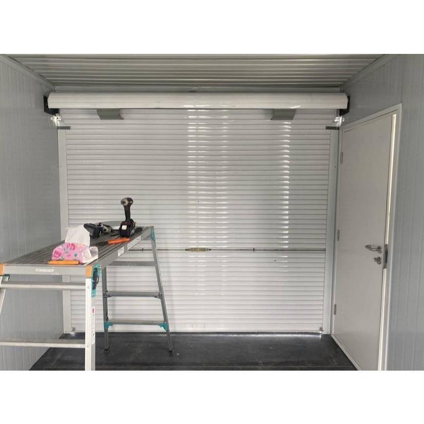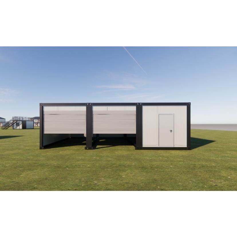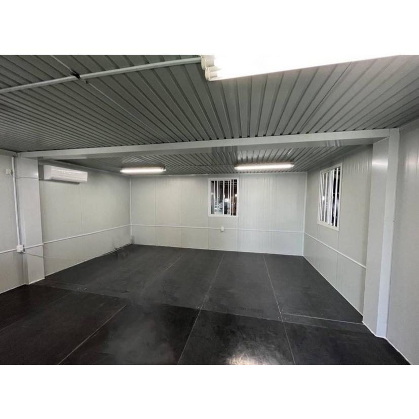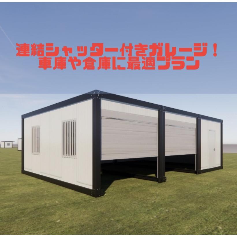 画像のものは11畳のユニットハウスを3棟連結し、2か所シャッターを取りつけた事例となります。出品価格は11畳タイプにシャッターを取り付けた1棟での金額になっております。さらに本体の色を変更し、ユニットハウスっぽくない外観にすることもできます。◆基礎工事と確認申請は、弊社ではご対応しておりませんので、お客様の方でご対応お願いしております。