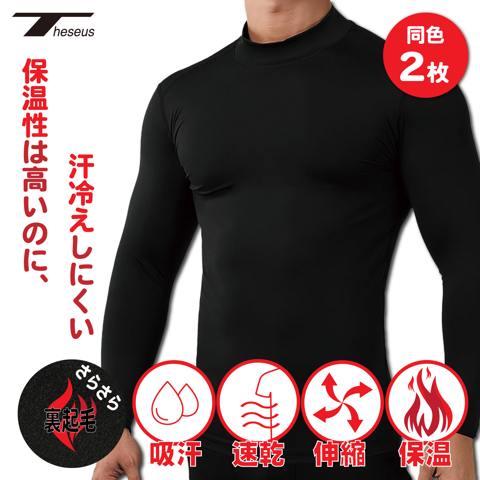 裏起毛 コンプレッションウェア 同色2枚セット メンズ スポーツインナー 冬用 暖かい 防寒インナー 長袖 アンダーウェア シャツ THESEUS テセウス