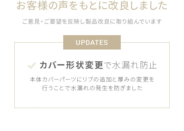お客様の声を基に、従来品より本体カバーパーツの仕様変更を実施。水漏れの発生を防ぐ改良を行っております。