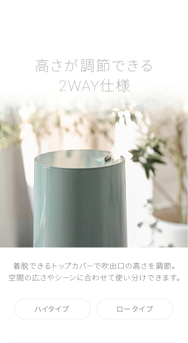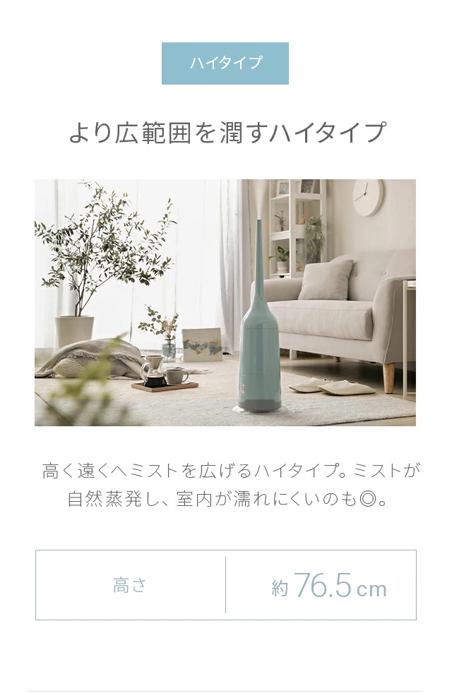 ハイタイプ…高く遠くへミストを広げるため、ミストが自然蒸発しやすく室内が濡れにくい。(高さ:約76.5cm)