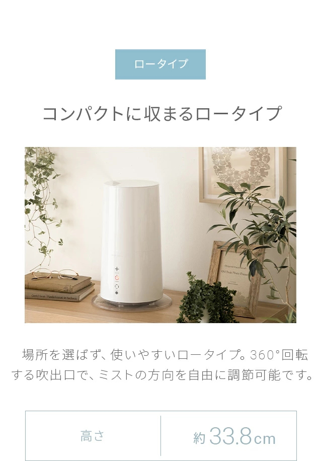 ロータイプ…コンパクトで場所を選ばない。360°回転する吹き出し口がありミストの方向を自由に調整可能。