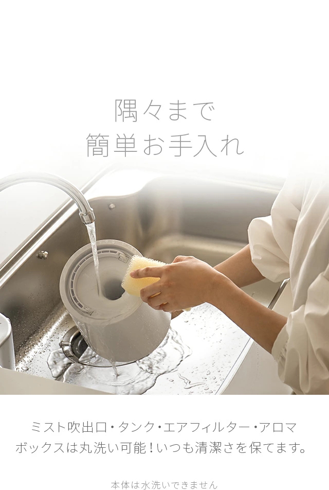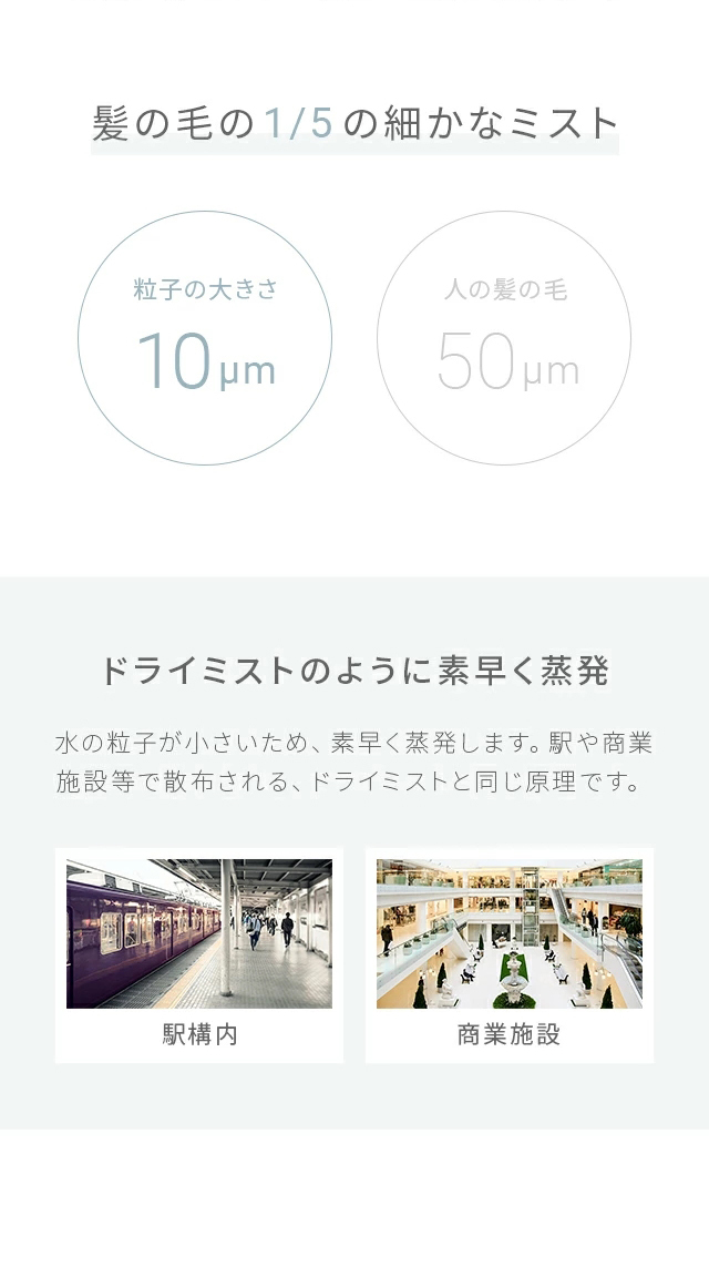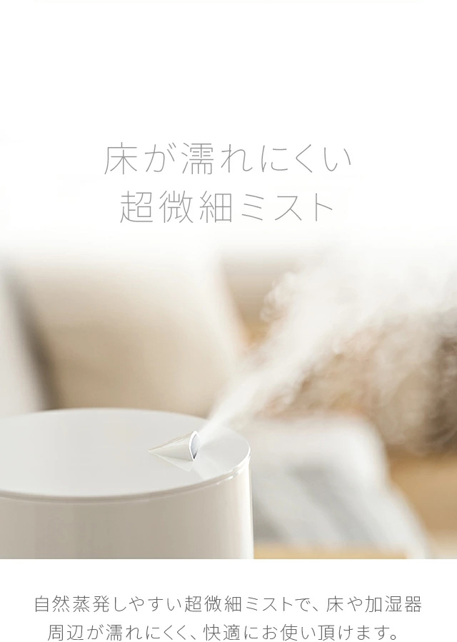 また、人の髪の毛よりも細かい15μmのミストを採用。自然蒸発しやすく床や加湿器周辺が濡れにくく快適に使用いただけます。