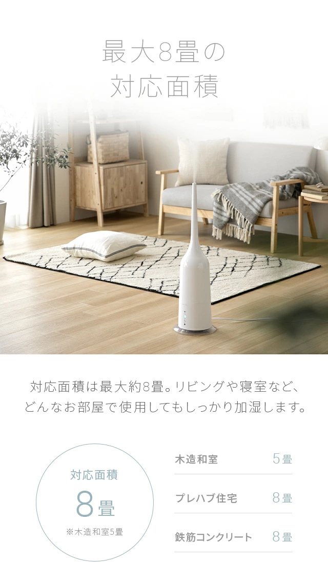 対応面積は最大8畳。リビングや和室などどんなお部屋でもしっかり加湿します。