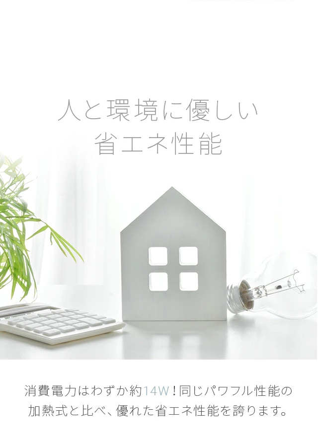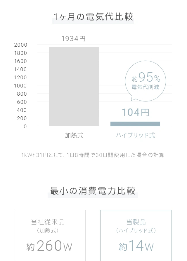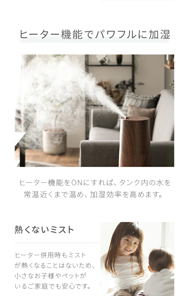 消費電力の少ない超音波式と加湿能力の高い加熱気化式、2つのいいところを取り入れております。