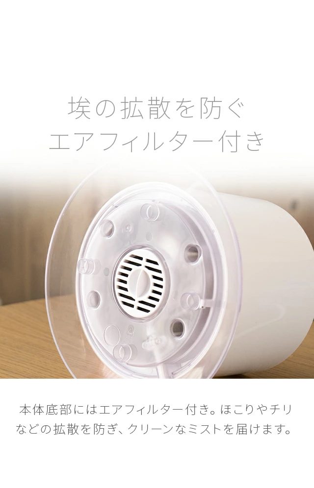 底部を照らすLEDライトを搭載。インテリア性も高く視覚的にも癒しを与えます。※ミストが出ている間のみ点灯いたします。