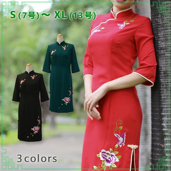 中華刺繍チャイナドレス 七分袖 ひざ丈 / チャイナ服 旗袍 民族衣装 二胡衣装 チャイナワンピース コスプレ衣装