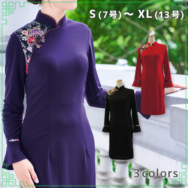 よく伸びて動きやすい生地が特徴の長袖チャイナドレスです。無地の生地に和柄組み合わせたデザインが印象的なドレスは、何といってものびのび生地が着心地◎ 生地がとても柔らかいので体に程よくフィットし、スタイルもより良く見えますよ。