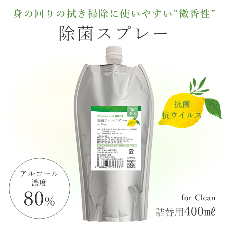 詰め替え 天然アロマ 抗菌 除菌 アロマスプレー for Clean (400ml詰替用) 微香性 消臭スプレー エコパック リフィル 衣類 掃除 感染対策 アロミックスタイル