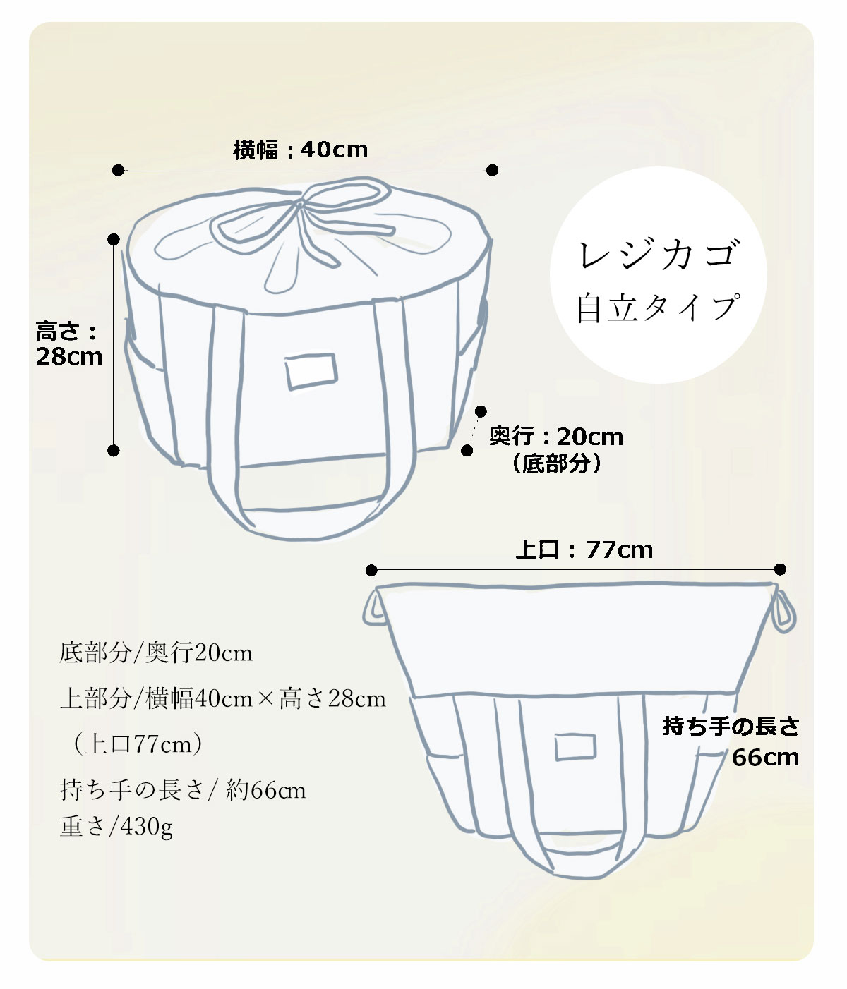 | サイズ | ■レジカゴ 底部分/奥行22cm 上部分/横幅40cm×高さ27cm (上口69cm) 持ち手の長さ/66cm 重さ/338g ■レジカゴ自立タイプ 底部分/奥行20cm 上部分/横幅40cm×高さ28cm (上口77cm) 持ち手の長さ/66cm(ラベンダーのみ 53cm) 重さ/430g |
