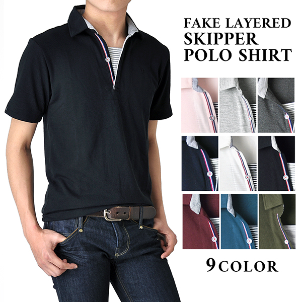 クールな着こなしを演出する重ね着風スキッパーポロシャツ。通気性に優れたTCカノコ素材を使用。前タテや袖裏に爽やかなヒッコリーストライプを配することで鮮度の高いデザインに仕上がっています。長袖Tシャツと組み合わせたレイヤードスタイルもオススメ。