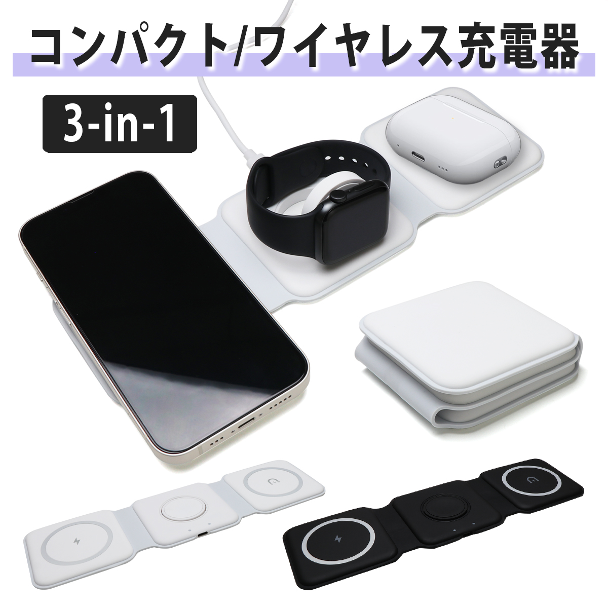 3つのデバイス(QI充電対応のiPhone、Apple Watch、Air Pods)をコンパクトに充電可能。コンセントは1個だけしか使用しないため、コンセント周りがすっきりします。