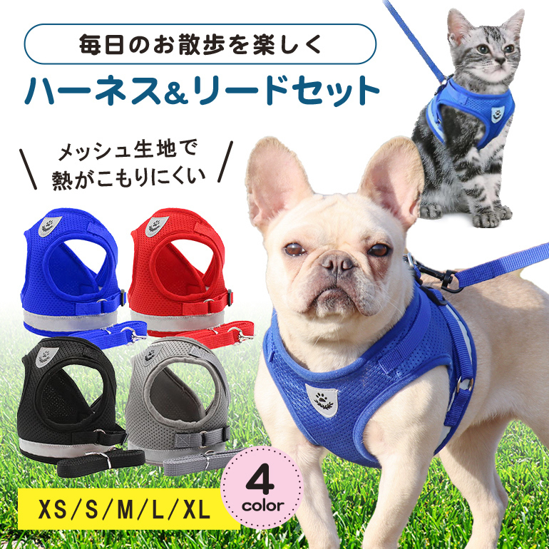 猫 犬 ハーネス リード ペット 胴輪 首輪 猫 ドッグ キャット 散歩 かわいい メッシュ 涼しい 反射板 服 小型犬 中型犬 リードセット お出かけ用 おしゃれ
