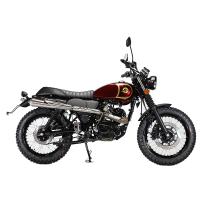 スクランブラーらしいアップマフラーや、質感の高いワインレッドの塗装が、紳士の国の英国らしい雰囲気が漂ってます。