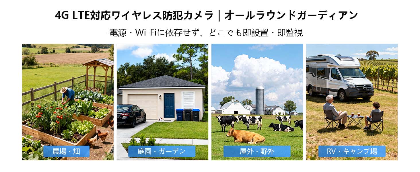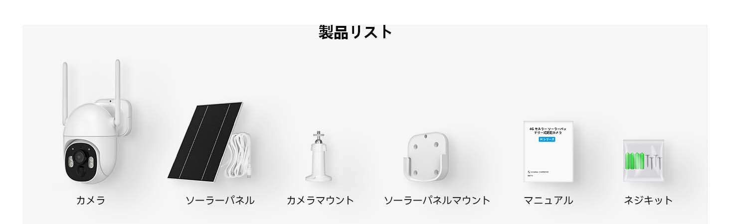 | 多くのお客様に当商品が選ばれている理由 | ★【技適認証済み】 ★【4G通信対応(Wi-Fi不要)|内蔵SIMカード・契約不要ですぐ使える】 Wi-Fi環境がなくても使用できる、4G LTE対応の完全ワイヤレス監視カメラ。 面倒なWi-Fi設定や配線工事は一切不要。契約不要の内蔵SIMカードを搭載しており、電源を入れるだけで、電波が届く場所ならどこでもすぐに監視を開始できます。 【注意事項】 【注意事項】 ※ 内蔵SIMカードは、初回アクティベーション時に【300MBの通信量を無料プレゼント】。 まずはお試しでご利用いただけます。 無料通信量を使い切った後も、月額プランにて引き続きご利用可能です。 データ量無制限で、格安料金は1ヶ月1,999円(税込)、6ヶ月10,999円(税込)、1年19,999円(税込)です。 ★【ソーラー充電式(電源不要)|完全コードレス設計】 高効率ソーラーパネルと大容量バッテリーを内蔵し、電源コード・コンセント不要。 太陽光で自動充電しながら24時間365日連続稼働を実現します。 電気代ゼロで経済的、配線工事が難しい屋外や離れた場所にも最適。 環境にやさしいクリーンエネルギーを活用した、長期運用に強い防犯カメラです。 ★【PIR赤外線センサー搭載|高精度人感検知】 体温(熱源)を検知するPIR赤外線センサーを採用。 風による木の揺れ、影の変化、虫の飛来などには反応せず、人や動物の動きのみを高精度で検知します。 検知距離・感度はアプリから細かく設定可能。 誤警報を大幅に削減し、必要な通知だけを受け取れる省電力設計です。 ★【300万画素・355°パン&チルト対応】 300万画素の高画質カメラを搭載。 スマホアプリのフリック操作で水平355°・垂直90°の遠隔操作が可能。 庭・駐車場・敷地全体など、広範囲を1台でしっかり監視できます。 ★【双方向通話】 マイクとスピーカーが付き、外出先でもご家族と来客や配送員と通話可能です。また、撮影範囲で、不審者を検知すると、アプリから不審者に声かけたり、投光威嚇で不審者を警戒させ、侵入を防止する。 ★【家族・複数人で共有可能】 スマホアプリからいつでも確認可能。 遠隔地でも状況を即時に把握できます。 アカウント共有人数は制限なし、1台のカメラを最大3人まで同時視聴可能。 家族やスタッフとの情報共有にも便利です。 ★【防水レベル:IP65防水レベル風雨など悪状況でも対応】 |