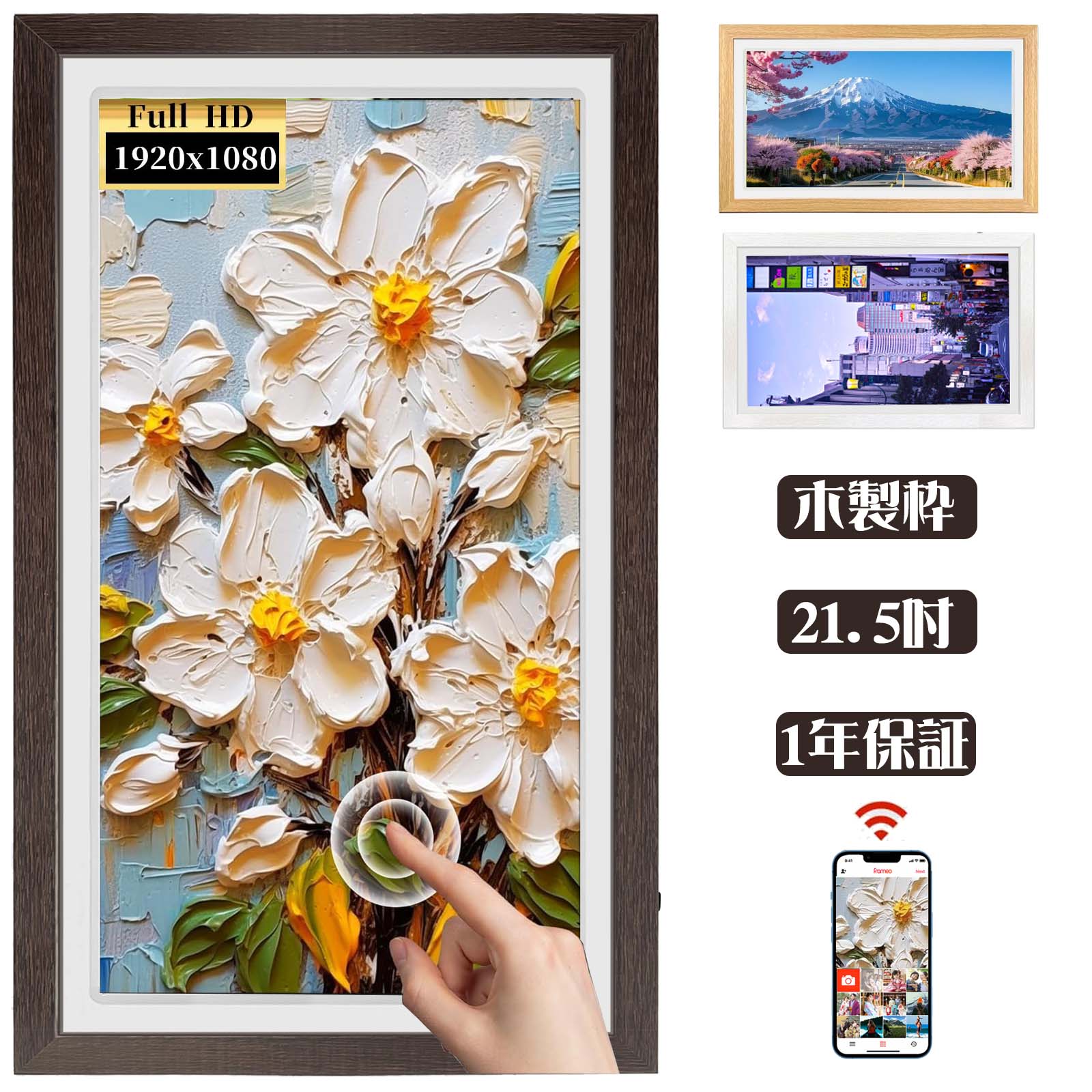 デジタルフォトフレーム 21.5インチ wifi 木製枠 大型画面 電源自動on/off 1920*1080FHD タッチスクリーン写真立て 遠隔送信 32GB内蔵 ギフト プレゼントに適用