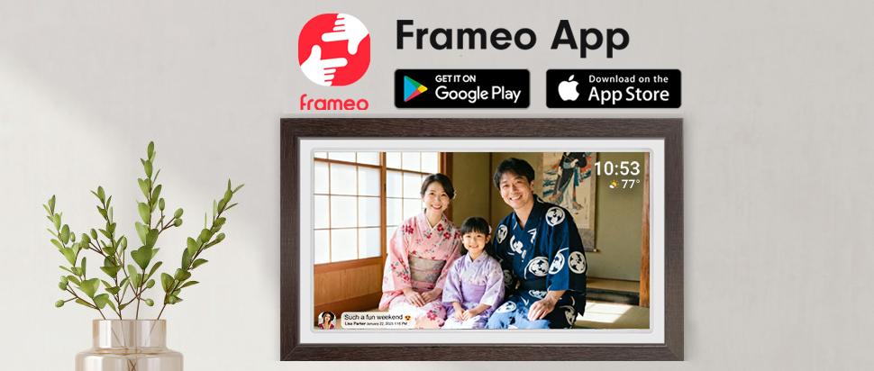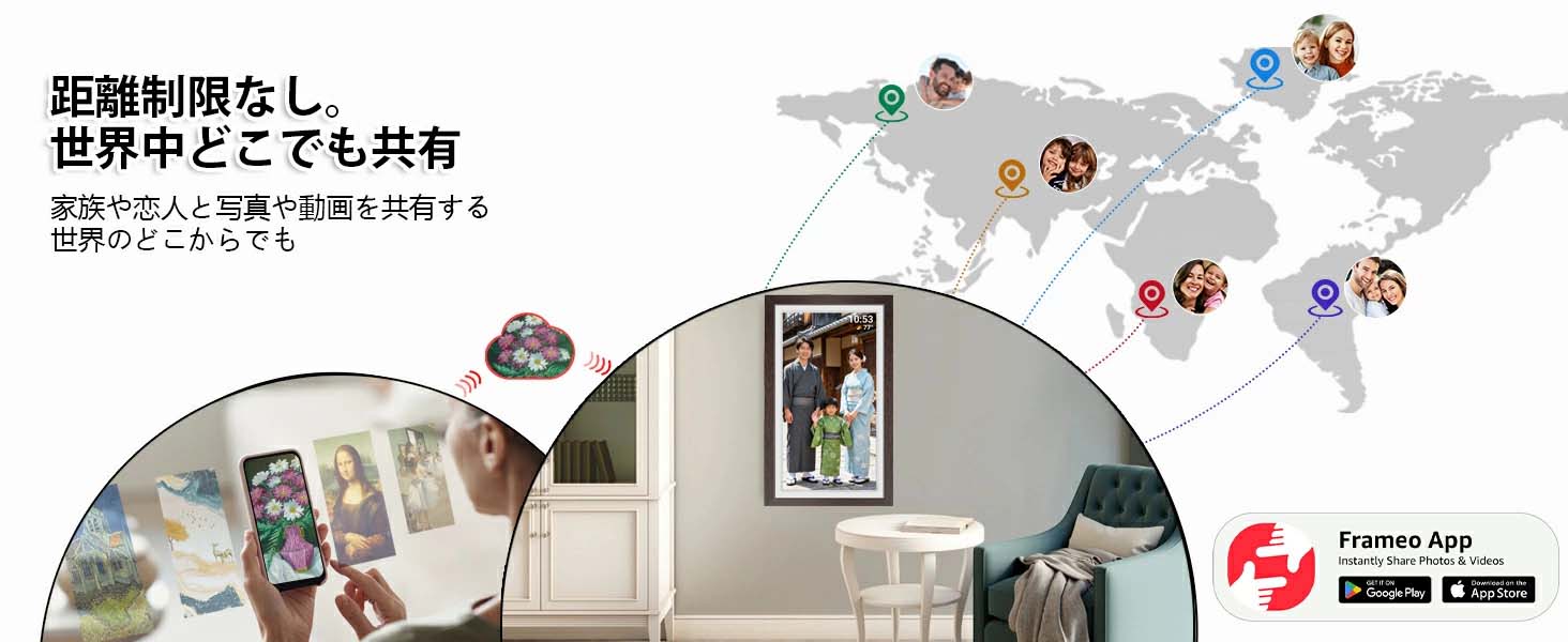 【リモートシェアリング、即時インタラクション】Frameoアプリを使って、どこにいても写真や動画を瞬時にフレームにアップロードし、家族と生活のひとときを共有。距離を縮め、愛を遅延なく伝えます。