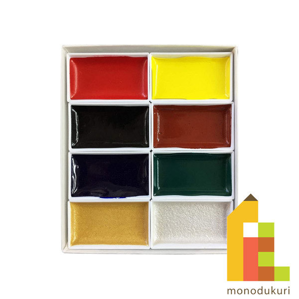 水干絵の具やチューブ絵の具と同じ顔料に、天然高級デンプン質と膠分を加え練り混ぜ、角皿に入れて乾燥させたものを顔彩と言います。