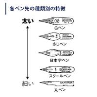 サジペンは、若干の線の強弱(太い線、細い線)と均一な太目の線が書けるペン先です。