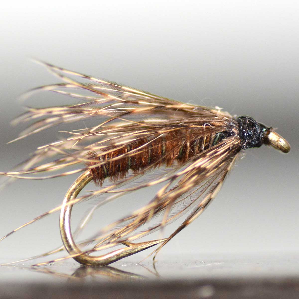 フェザントテールの落ち着いたブラウンボディと、柔らかく開閉するソフトハックルが、水中で繊細な生命感を演出。