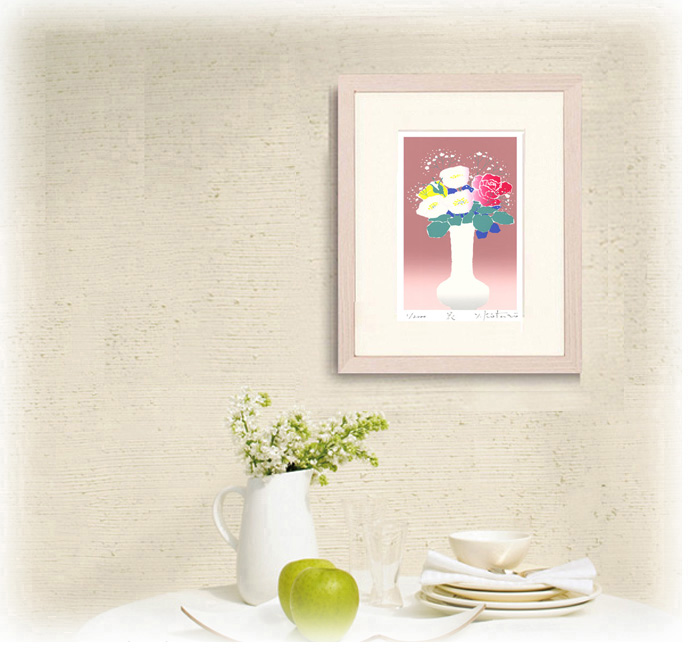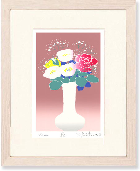 吉岡浩太郎 インテリアアート界の第一線で活躍し、シルクスクリーン版画の第一人者として不動の地位を確立した画家です。 アートワーク : 花「花」は、シンプルながらも華やかな花々の静物画です。