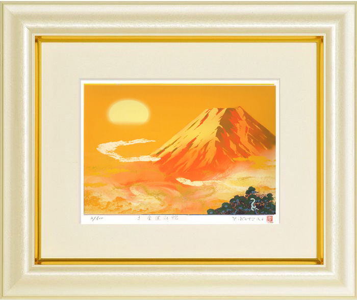 「金運白蛇」は、白蛇と黄金に輝く富士山を描いた縁起の良い絵画です。