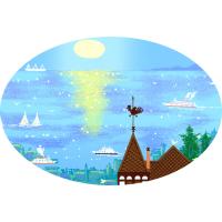 洋風の建物の屋根に立つ風見鶏が象徴的に描かれ、背景には輝く海と行き交う船が広がります。
