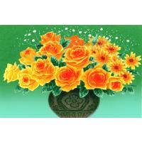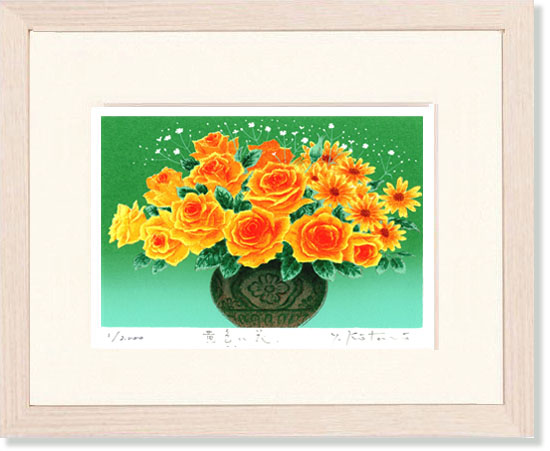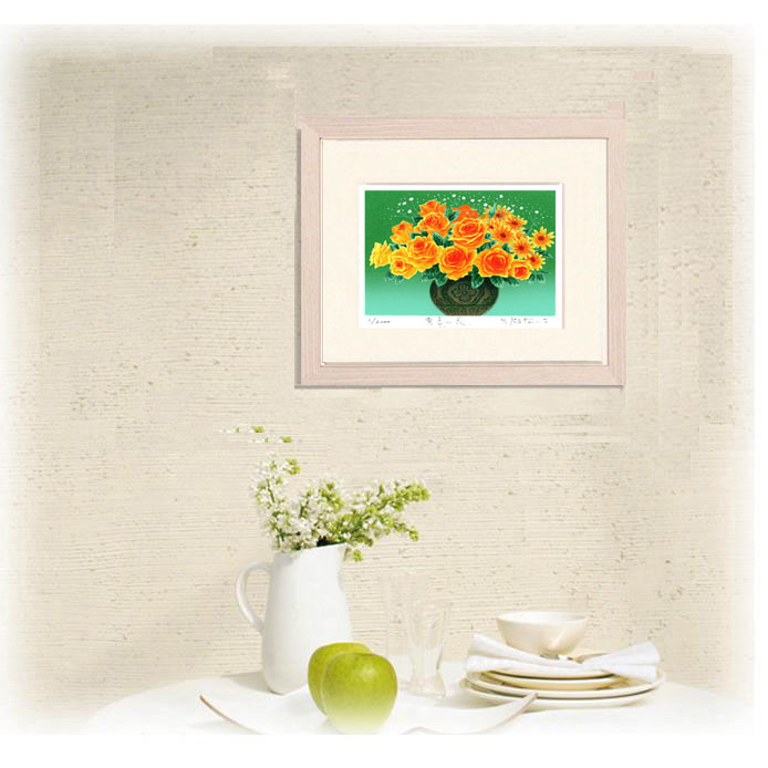 吉岡浩太郎 インテリアアート界の第一線で活躍し、シルクスクリーン版画の第一人者として不動の地位を確立した画家です。 アートワーク : 黄色い花黄色い花」は、鮮やかな黄色のバラとガーベラが華やかに咲き誇る作品です。