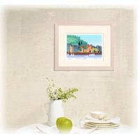 カラフルな建物や停泊するヨットが、温かみのあるタッチで表現され、活気と穏やかさが共存する風景が魅力です。