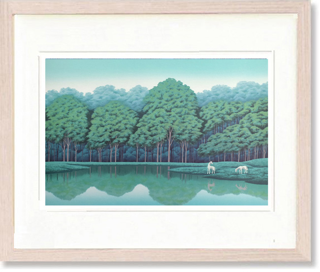 深く澄んだ青色の湖面と木立を静謐に描いた一作です。