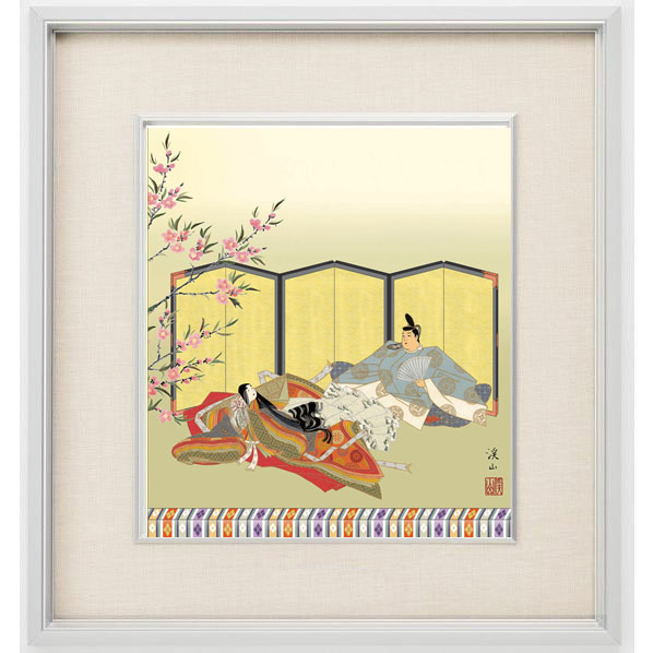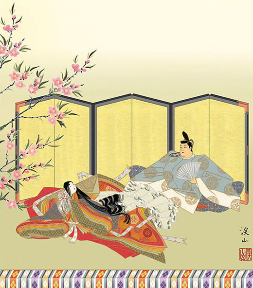 華やかな十二単と屏風、桜が調和し、和歌を詠む雅な世界を美しく表現しています。
