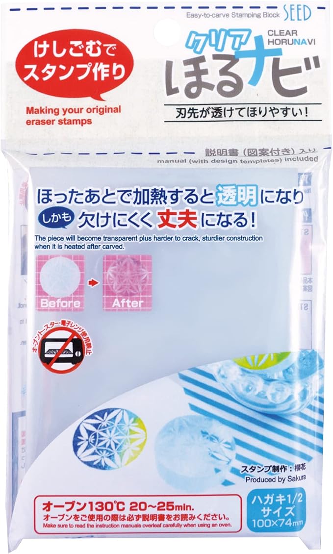 「クリアほるナビ」は、オーブンで加熱することで透明になる半透明なスタンプ用けしごむです。