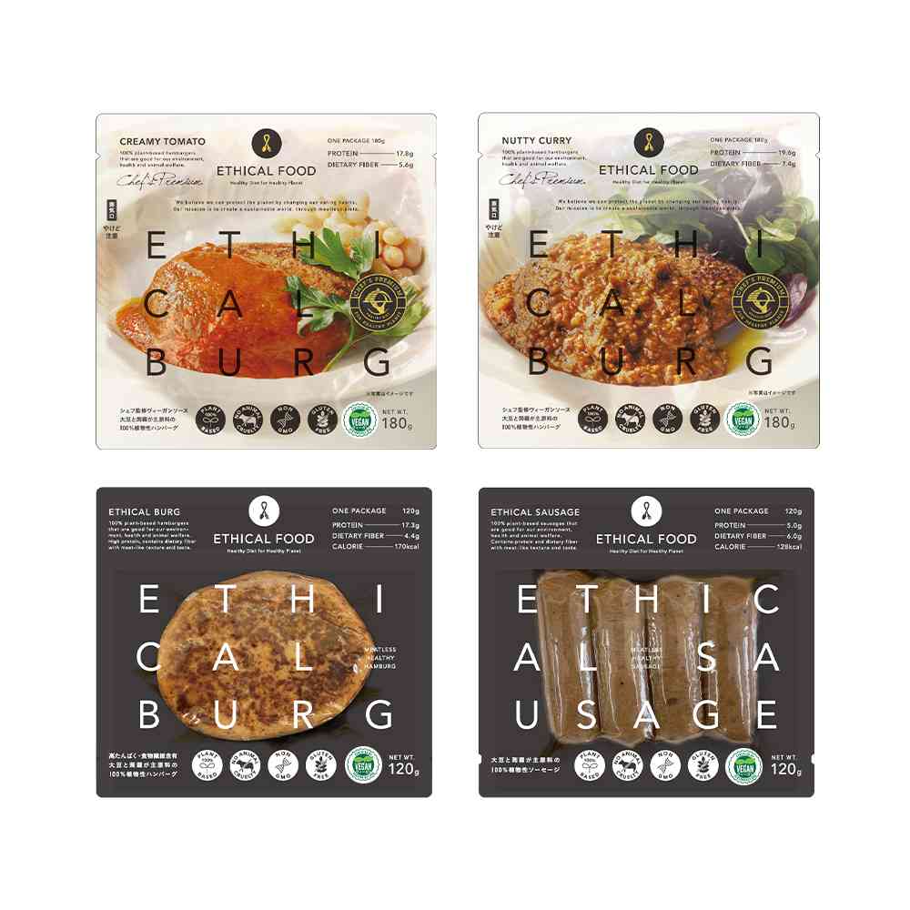 エシカルバーグ:120g/個、エシカルソーセージ:30g×4本/袋、シェフズプレミアムナッツィカリー:180g/個、シェフズプレミアムクリーミートマト:180g/個