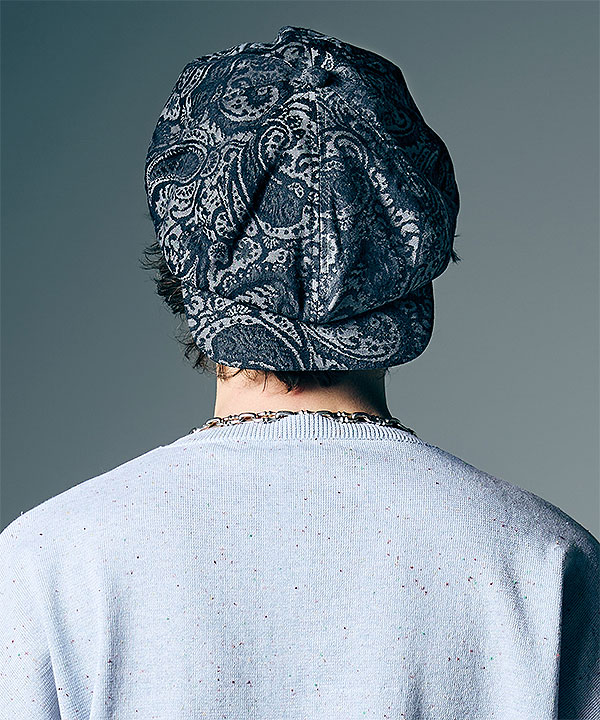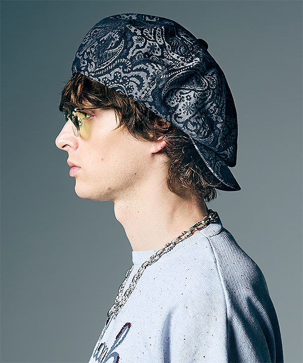 キャスケットとハンチングというパンクスタイル定番のモチーフを融合したDeformed Casquette。シルエットはキャスケットのボリュームある形状をベースにしながら、横幅をハンチングのようにタイトに。前被りの他、フロントトゥバックで額部分にボリュームを持たせれば真新しいシルエットが生まれます。2色のカラーバリエーションはGrayはペイズリージャカード、Blackはワッフルとそれぞれムード異なるテキスタイルでご用意。