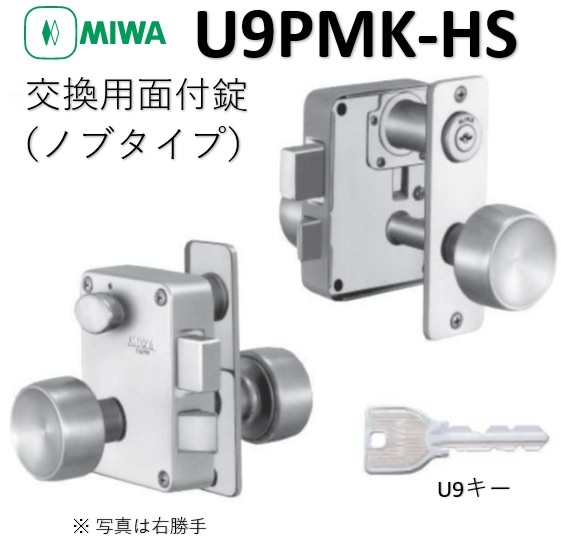 MIWA ミワ U9 PMK-HS 75PM 交換用面付錠 ノブタイプ DT36 (右勝手/左勝手) 美和ロック 鍵交換 かぎ交換