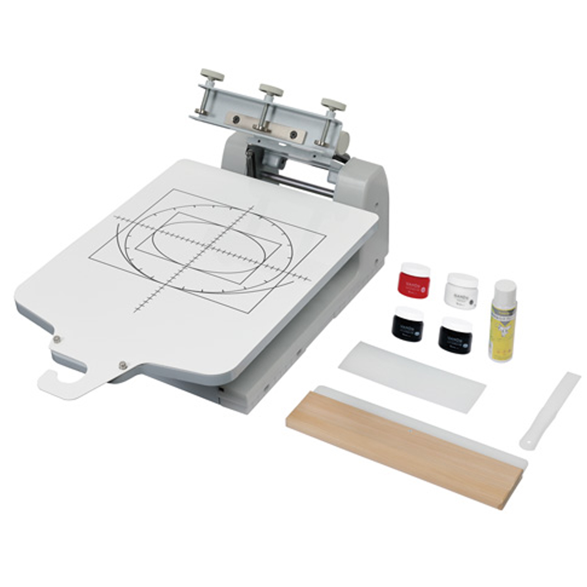 付属品:Tシャツ多色印刷用ハンガーパネルLL5枚、インクへら1本、スプレーのり80mL1本、業務用スキージー360mm1個、水性一般インク(黒、白、黄、赤、青、緑)100g各1個、取扱説明書、保証書