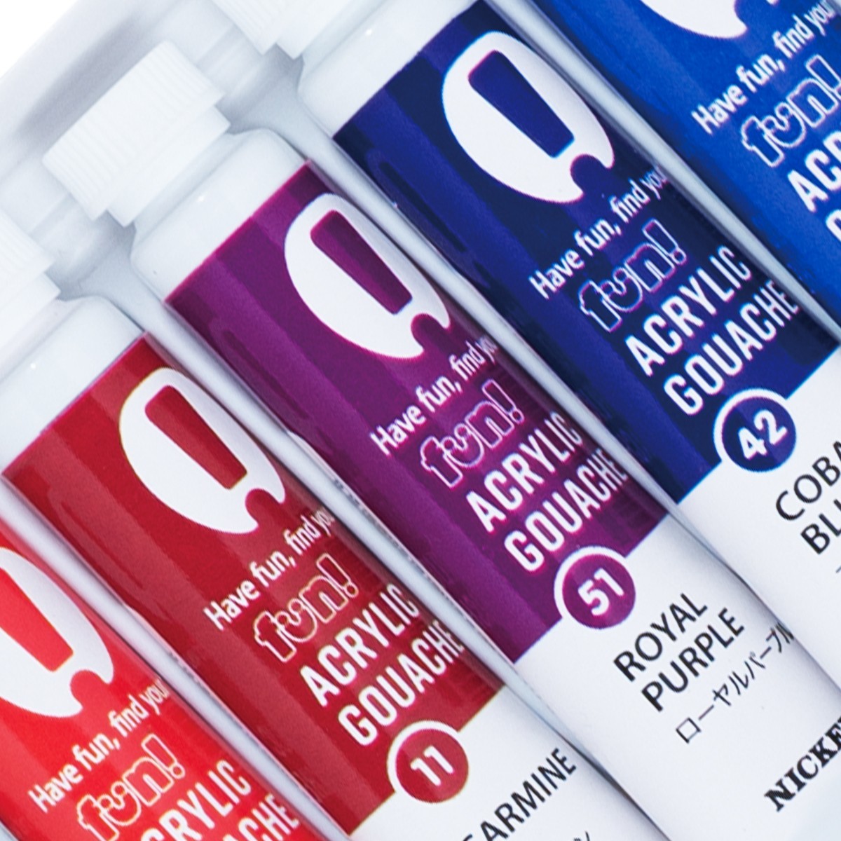 ファン・アクリックガッシュは、マットで鮮やかな画面に仕上がる不透明なアクリル絵具です。優れた隠蔽力とムラのないなめらかな塗り心地が得られます。乾くと耐水性になり、重ね塗りをしてもにじむことはありません。紙のほか、金属・プラスチック・木・石・布など様々な素材に描くことができるので工作にも活用できます。