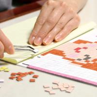 前面に貼ったり、ドット絵風など色々な楽しみ方ができます。別売りの専用糊付シート「ペーパーモザイクチップス 専用台紙 のり付」もございます。