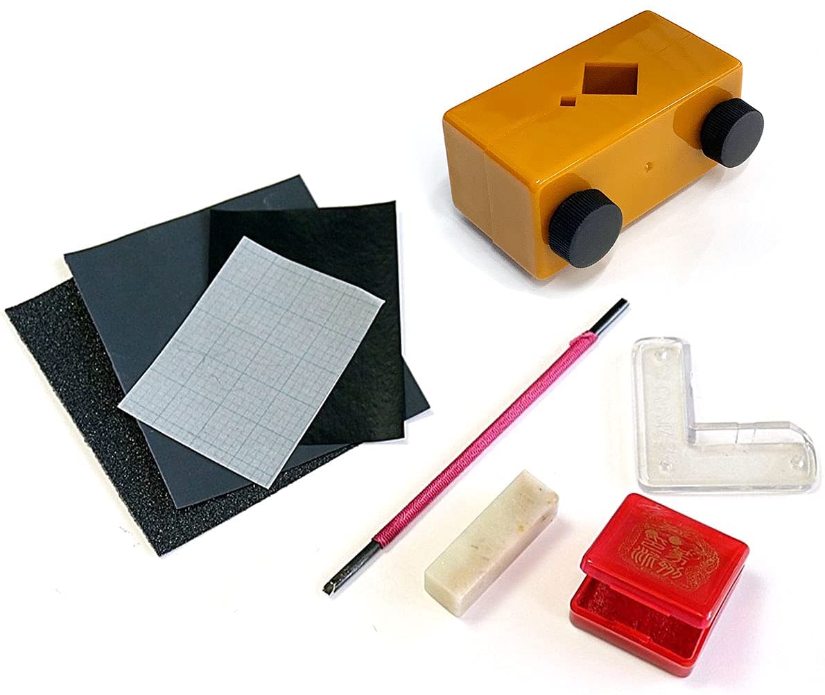 遼凍石12mm角、糸巻きてんこく刀平4mm、印泥角型(有効印面35×35mm)、印押定規、耐水ペーパー#80・#800、トレーシングペーパー、カーボン紙、取扱説明書