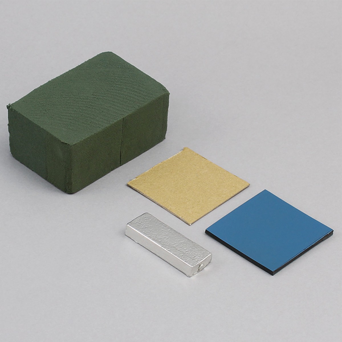セット内容:オアシス(約80×55×厚さ38mm)×1個、ボール紙(50×50×1mm厚)1枚、版画用ゴム板(50×50×3mm厚)1枚、ピューター・インゴット(40g)1個