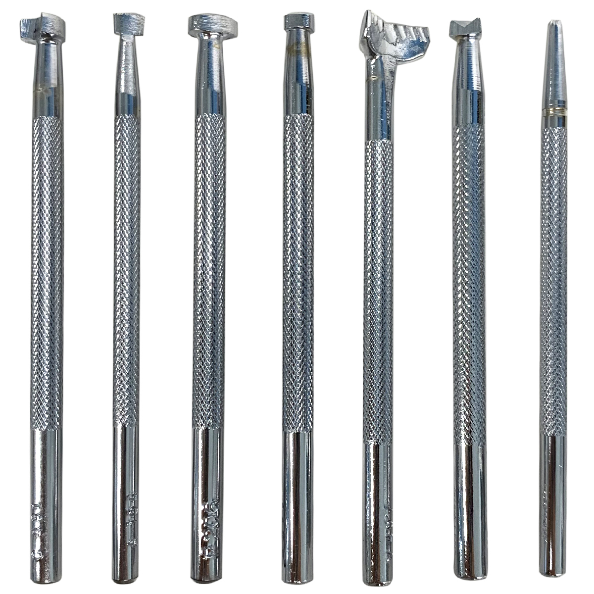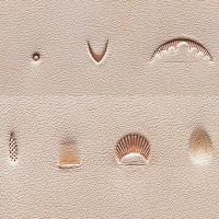 レザークラフトキットの入組品になっている基本刻印棒7本セットと同一品で、装飾模様を刻印する作業に必要にして十分な組み合わせです。