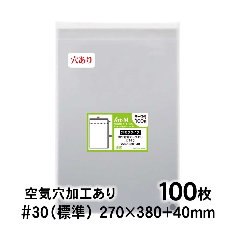OPP袋 B4 空気穴あり テープ付 100枚 30ミクロン厚(標準) 270×380+40mm 透明袋 国産 二つ折り発送