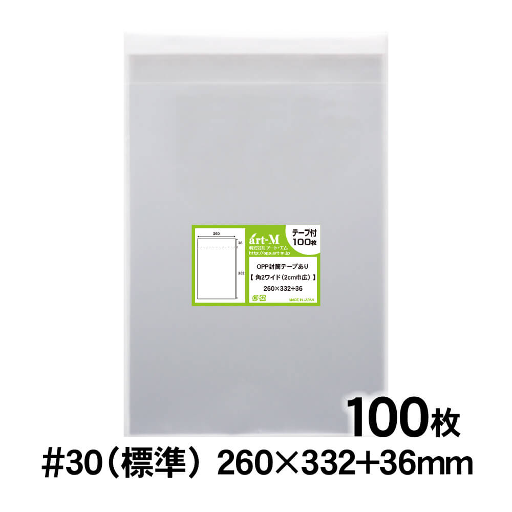 OPP袋 角2ワイド 2cm巾広 テープ付 100枚 透明袋 国産 30ミクロン厚(標準) 260×332+36mm 二つ折り発送