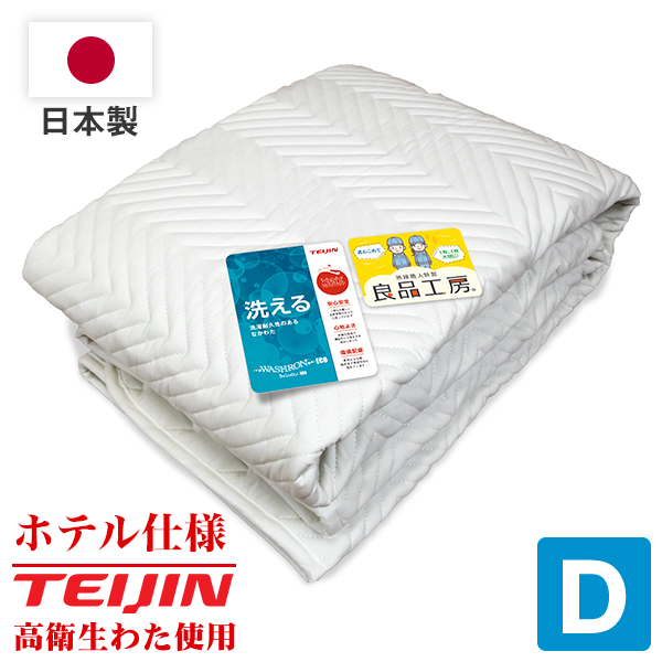 | ・日本有名メーカー「テイジン」の高衛生わたを使用! ・型崩れしにくい特殊加工「電光キルト」で耐久性バツグン! ・綿100%生地だから、汗をかいてもムレにくい! ・ゴムバンド式で敷布団やマットレスなど様々な厚さに対応! ・厳しい品質検査にクリアした「良品工房®」ラベル添付 ・お手持ちのボックスシーツと併用すればベッドパッドとしてもお使いいただけます。 ・安心の日本製 | |