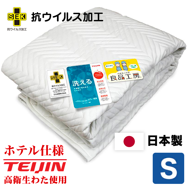 | ・繊維上の特定ウイルスの数を99%以上減少させる加工を生地に施しています。 JISL1922(繊維製品の抗ウイルス性試験方法)に従って検査を行い、効果が確認されています。 使用薬剤や製品の高い安全性も確認されています。 ・日本有名メーカー「テイジン」の高衛生わたを使用! ・型崩れしにくい特殊加工「電光キルト」で耐久性バツグン! ・綿100%生地だから、汗をかいてもムレにくい! ・ゴムバンド式で敷布団やマットレスなど様々な厚さに対応! ・厳しい品質検査にクリアした「良品工房®」ラベル添付 ・お手持ちのボックスシーツと併用すればベッドパッドとしてもお使いいただけます。 ・安心の日本製 | |