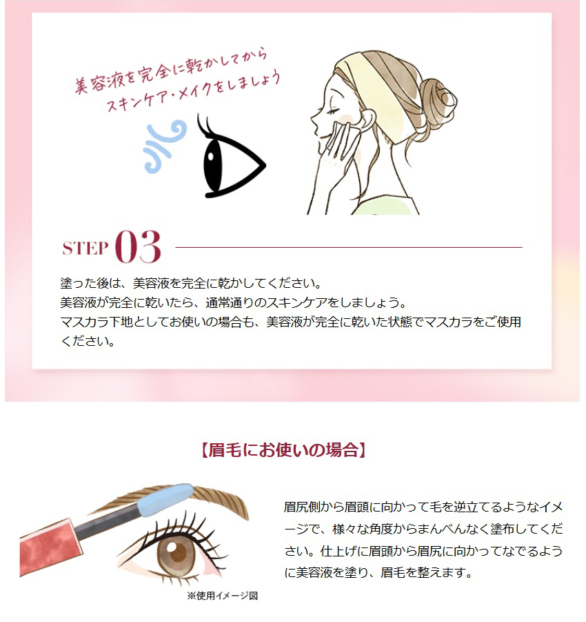 マスカラ下地としてお使いの場合も、美容液が完全に乾いた状態でマスカラをご使用ください。