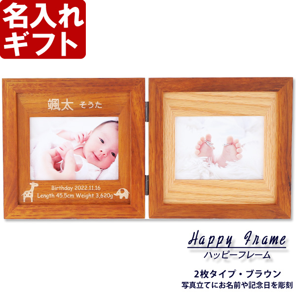 出産祝い ギフト プレゼント 名入れ フォトフレーム ハッピーフレーム 中枠レーザー彫刻 2枚開きタイプ ブラウン 写真立て 結婚祝い 内祝い 爆買