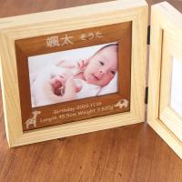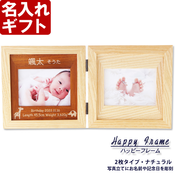 出産祝い ギフト プレゼント 名入れ フォトフレーム ハッピーフレーム 中枠レーザー彫刻 2枚開きタイプ ナチュラル 写真立て 結婚祝い 内祝い 70代 80代 爆買