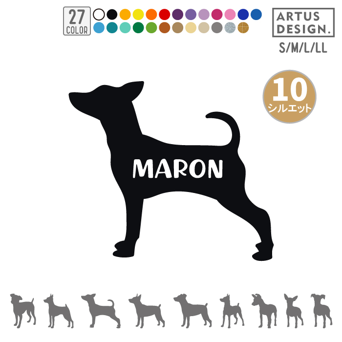 | 選択項目 | 【1】ステッカーの色を27色の中からお選びください。 【2】シルエットをお選びください。 【3】フォントを1〜12(または名前無し)の中からお選びください。 【4】シルエットの向きをお選びください。 【5】ワンちゃんのお名前を8文字以内でご記入下さい。(※アルファベット、ひらがな、カタカナのみ) |