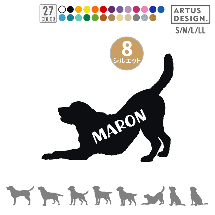| 選択項目 | 【1】ステッカーの色を27色の中からお選びください。 【2】シルエットをお選びください。 【3】フォントを1〜12(または名前無し)の中からお選びください。 【4】シルエットの向きをお選びください。 【5】ワンちゃんのお名前を8文字以内でご記入下さい。(※アルファベット、ひらがな、カタカナのみ) |
